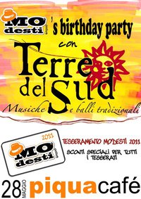 L’Associazione Mo’desti Onlus, invita tutti alla sua seconda festa di compleanno “Mo’desti’s 2nd Birthday Party’” che si terrà al Piqua Café di Guardiagrele sabato 28 maggio 2011 a partire dalle ore 19.00.