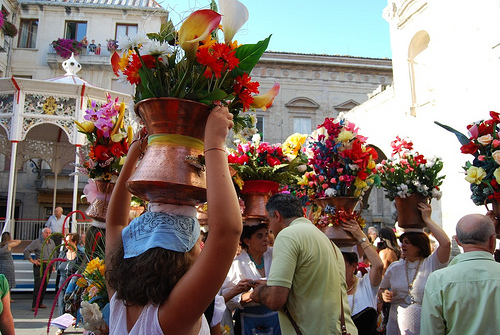 Memoria dell'antica devozione consistente nel donare alla chiesa i prodotti della terra e del lavoro dei campi, le donne, in costume tradizionale, recano sulla testa le tradizionali conche in rame oggi ornate con fiori.