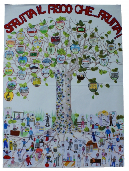 I ragazzi hanno rappresentato il fisco come un grande albero, dove le radici sono i lavoratori, che rappresentano la linfa vitale e con la loro contribuzione fanno sì che i frutti dell’albero (i servizi sanitari, scolastici, sociali, previdenziali, etc.) siano sani e forti. Al contrario se la contribuzione non è adeguata, l’albero stenta a crescere e non produce frutti copiosi e, di conseguenza, i servizi non basteranno a coprire le necessità di tutti i cittadini.
