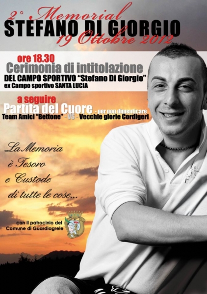 "La memoria è tesoro e custode di tutte le cose" : è questa la frase che compare sulla locandina di presentazione del secondo memorial dedicato a Stefano Di Giorgio, il giovane ragazzo di Pennapiedimonte, morto improvvisamente due anni fa, per un attacco cardiaco, dopo un allenamento di calcio.