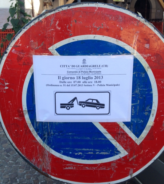 Sulla segnaletica viene specificato che il divieto di parcheggiare sull'intera area interesserà la giornata di domani, dalle ore 7 alle ore 18, come previsto dall'ordinanza n° 51 del 15.07.2013 su idelibera del settore V della Polizia Municipale, in cui inoltre si legge: "[...] ordina per il giorno 18 Luglio 2013, dalle ore 07:00 ale ore 18:00 ed, in prosecuzione, fino al termine dei lavori, l'stituzione del divieto di transito nella parte centrale di Largo Garibaldi, consentendo la circolazione dei veicoli sui due lati esterni della stessa Piazza".
