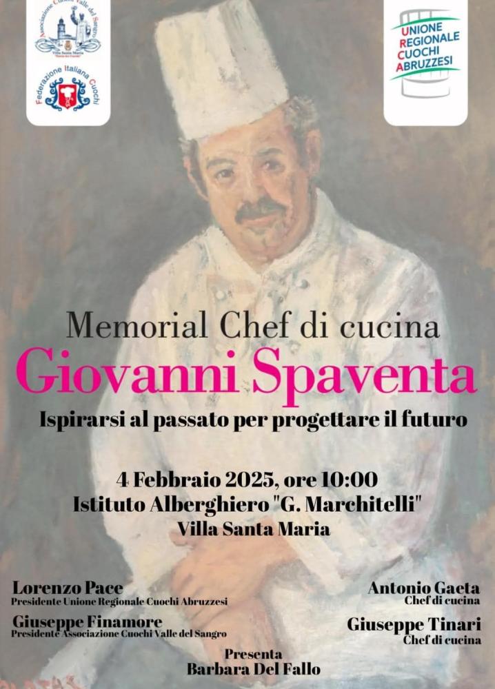 Alle ore 10.00 oggi si terrà presso l'istituto alberghiero di Villa Santa Maria (Ch), si terrà la quarta edizione del Memorial Chef di cucina Giovanni Spaventa.